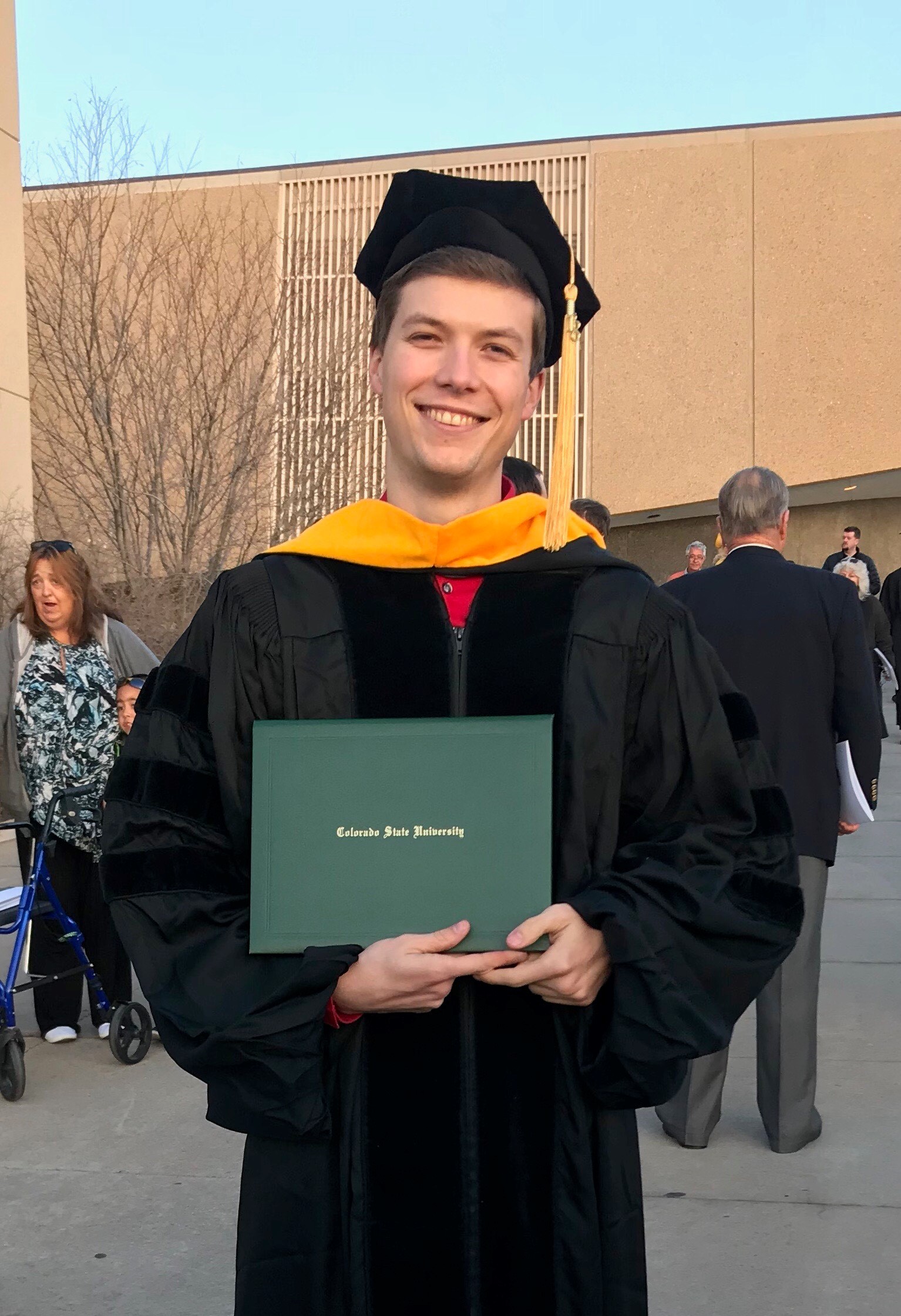 Daniel Richardson smiles with a new Doctorate degree