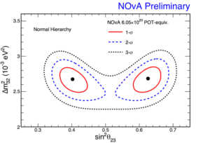 Contour of mass splitting vs sin^2(theta_32) for the NOvA experiment showing exclusion of maximal mixing to about 2.5 sigma.