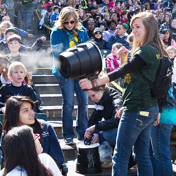 We said we would, but only if they would let us do something a bit different. We were willing to do a show, but we wanted the program to incorporate a hands-on component. We wanted each student to have a bag of science stuff, and we wanted to have demonstrations and activities run by 100 Colorado State University student volunteers in the stands.
