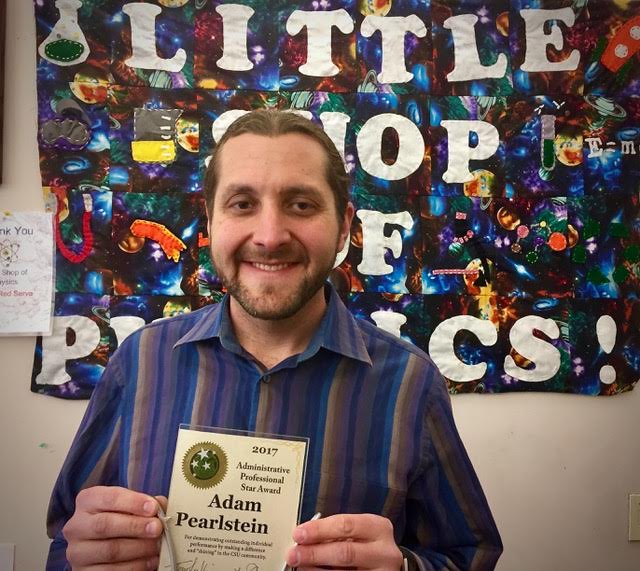 Adam Pearlstein, assistant director of the Little Shop of Physics, was recently recognized with an AP Star Award at the year Administrative Professional Council luncheon. Adam was one of 6 people so honored out of a large pool of nominees in Departments across campus. The award committee was particularly impressed with Adam’s willingness to go above and beyond in the service of students and the Department—such as teaching two different courses in addition to his work in the Little Shop—by his high standard of performance in everything that he does, and by his ability to make effective use of limited resources. This is quite an honor. Congrats, Adam!