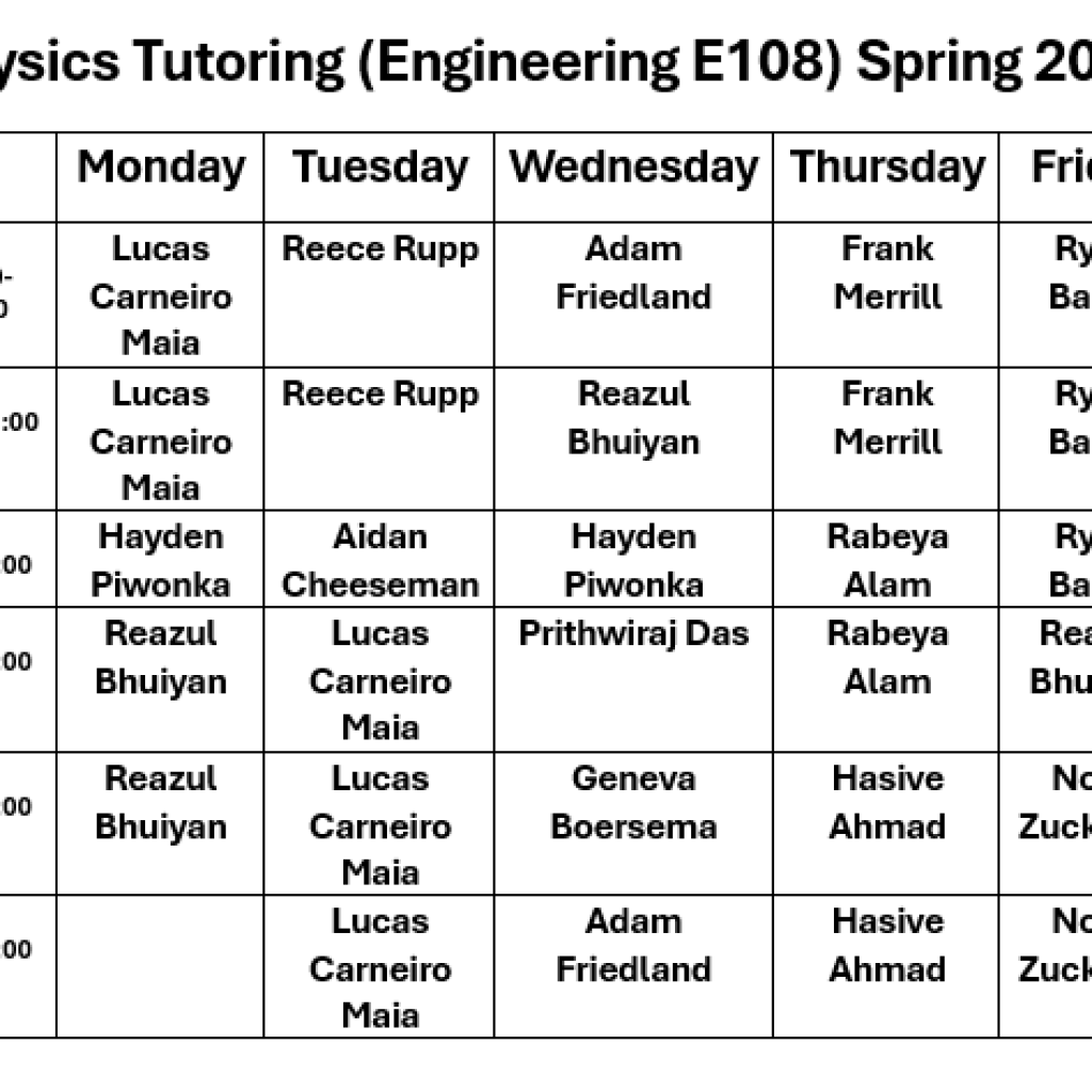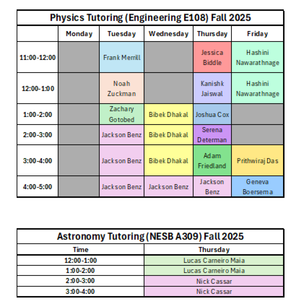 The Physics Department is offering tutoring help for those registered in currently offered undergraduate physics classes. The location of the tutoring room is in the Engineering building, E-wing, room #E108. Click on the image to the right to enlarge the tutoring schedule for the Fall of 2025.